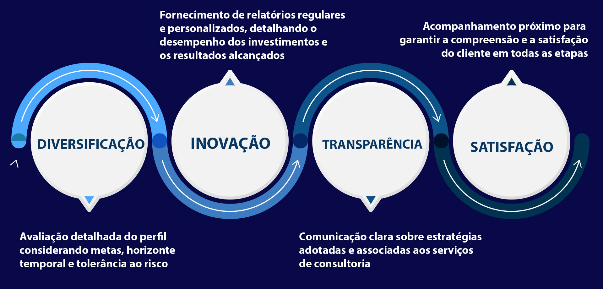 Fidelizar nosso cliente através de um atendimento voltado ao seu perfil e apresentar as oportunidades que o mercado oferece. Construção de um relacionamento baseado na transparência e engajamento com o cliente.